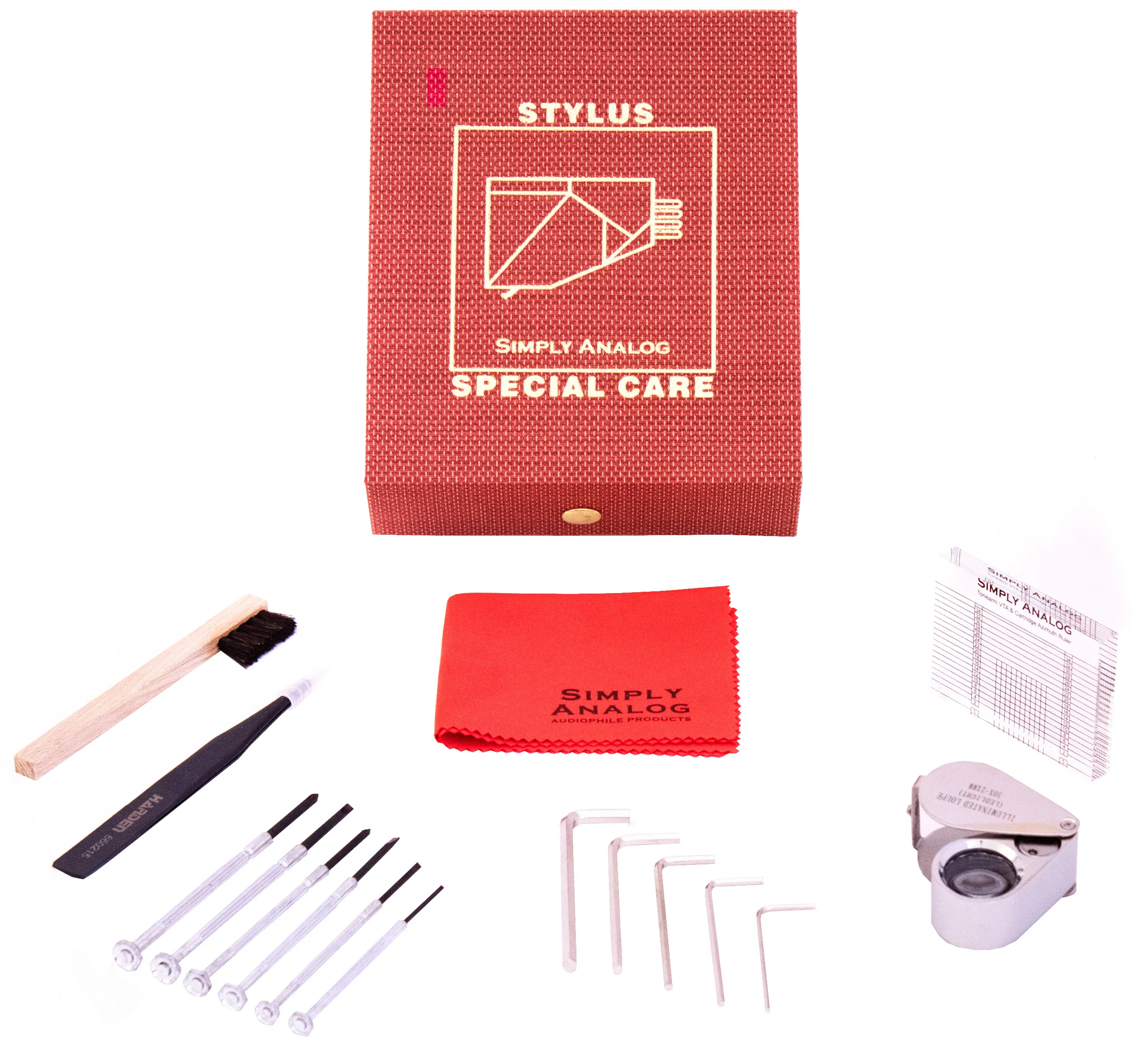 W środku: linijka VTA/Azymut, poziomica, komplet śrubokrętów i imbusów, lupa LED, pęseta oraz zestaw do czyszczenia igły (Stylus Cleaner 30 ml + szczoteczka). Dzięki temu można ustawić gramofon idealnie, poprawić geometrię wkładki i uzyskać brzmienie, które naprawdę wciąga.