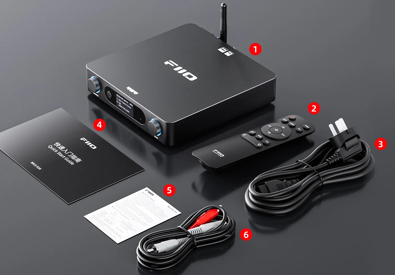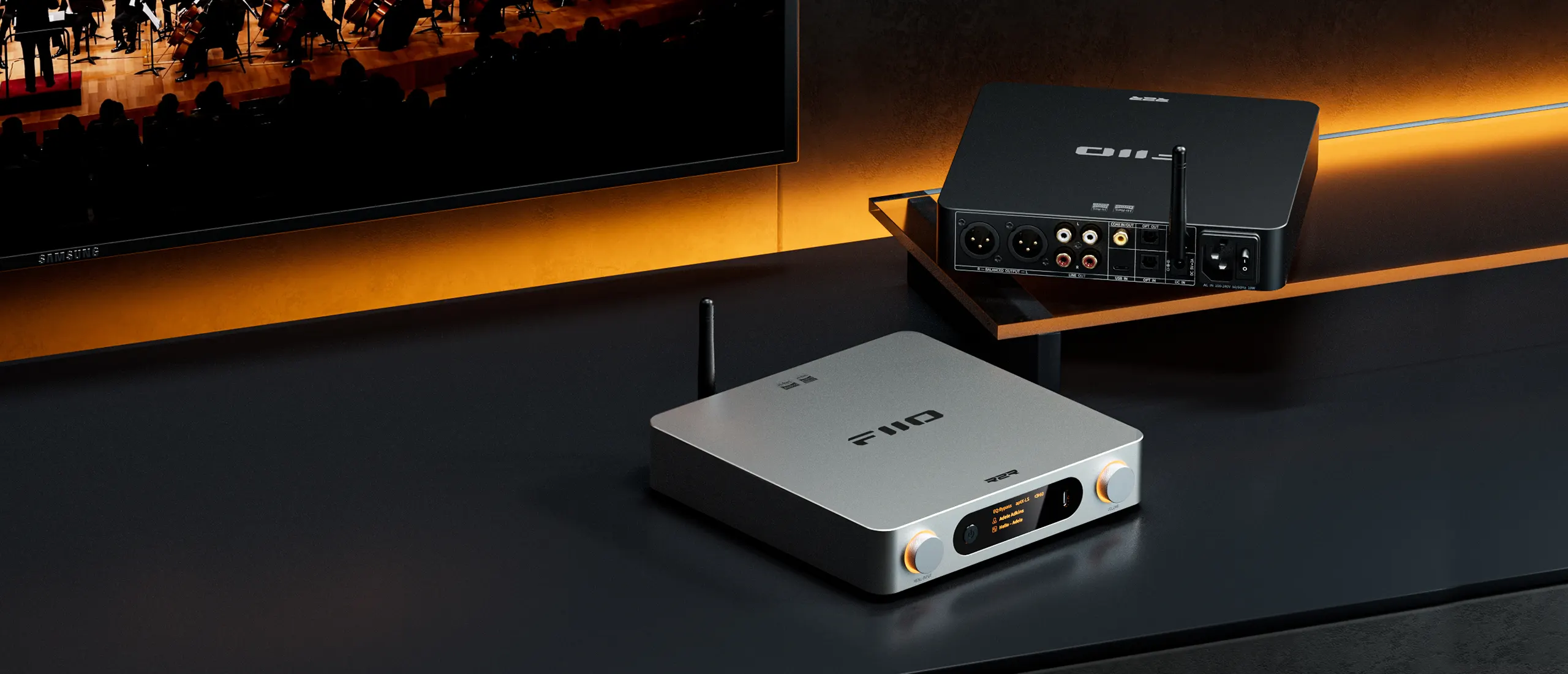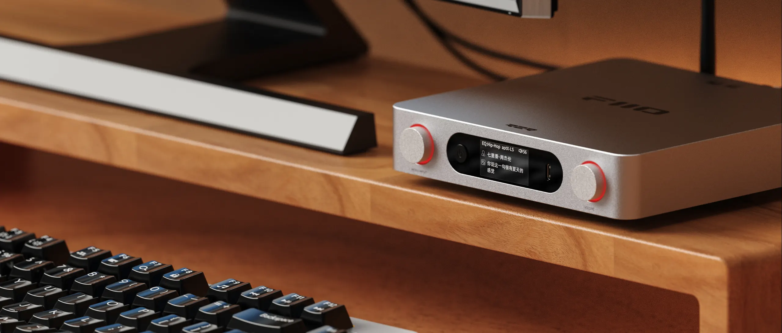 Podwójne pokrętła i ekran przedni ułatwiają obsługę przy biurku. Z większej odległości można korzystać z dołączonego pilota na podczerwień lub aplikacji FIIO Control.