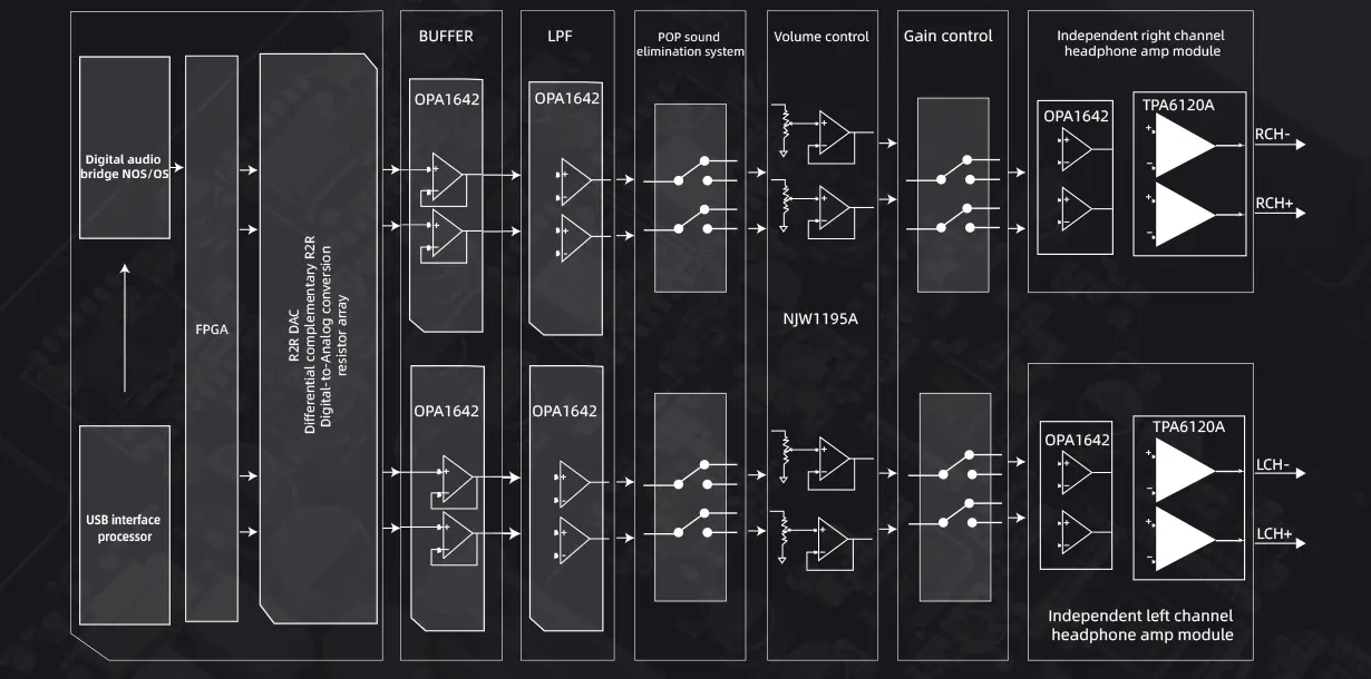 Od przetwornika DAC, przez filtr dolnoprzepustowy (LPF), regulację głośności, aż po wzmacniacz słuchawkowy – cały tor audio w K13 R2R jest w pełni różnicowy. Taka konstrukcja zapewnia minimalne zniekształcenia, skuteczne tłumienie zakłóceń oraz zachowanie pełnej dynamiki na każdym etapie sygnału. Dodatkowe funkcje, takie jak regulacja wzmocnienia, ochrona słuchawek i eliminacja trzasków przy włączaniu (POP noise), sprawiają, że układ jest nie tylko czysty brzmieniowo, ale też bezpieczny w użytkowaniu.