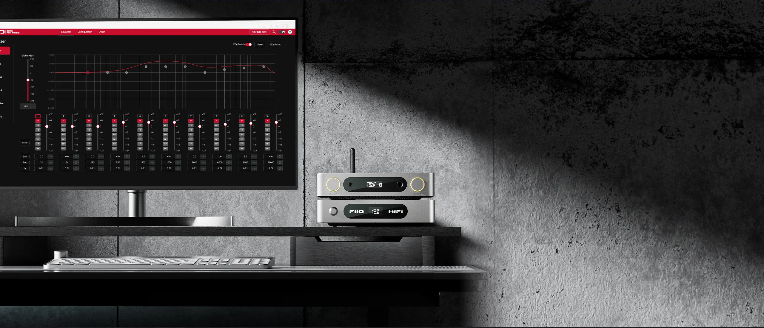 Dopasuj brzmienie do własnych upodobań dzięki wbudowanemu korektorowi parametrycznemu, opartemu na chipie XMOS XU316 i autorskim algorytmie strojenia FIIO. Korektor umożliwia regulację w 10 pasmach we wszystkich trybach pracy urządzenia. Za pomocą aplikacji FIIO Control lub interfejsu webowegomożesz wczytywać gotowe presety, takie jak „Retro PEQ”, dostosowywać charakterystykę do konkretnych modeli słuchawek lub udostępniać własne ustawienia EQ.