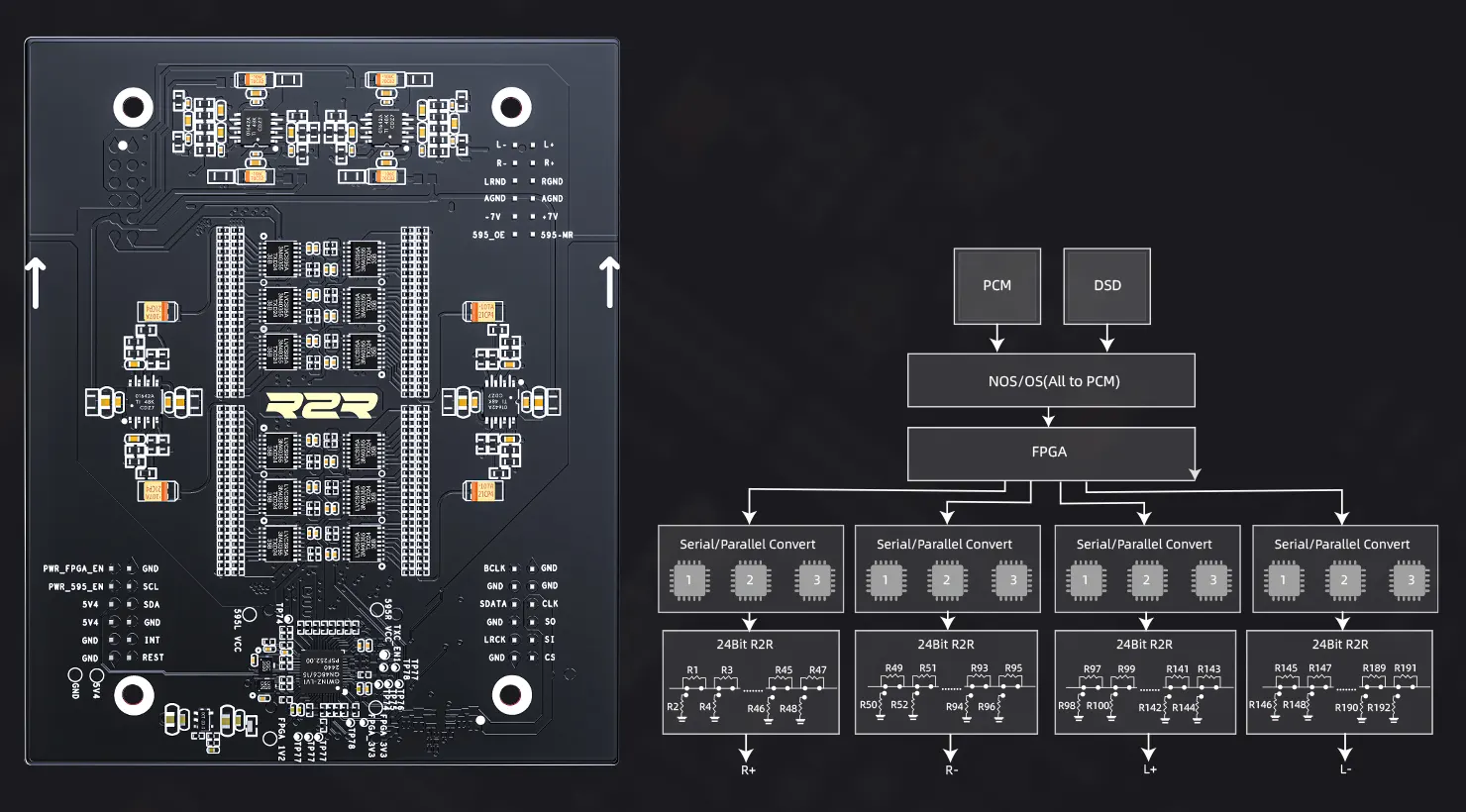 Sercem modelu K13 R2R są cztery kanały matryc rezystorowych, z których każdy zawiera 48 precyzyjnych rezystorów cienkowarstwowych – łącznie 192 elementy. Każdy rezystor został dopasowany z dokładnością do 0,1%, a jego parametry cechuje wyjątkowo niska podatność na zmiany temperatury. Efektem jest prawdziwy, w pełni różnicowy przetwornik R2R DAC o 24-bitowej rozdzielczości, który oferuje brzmienie bogate, naturalne i organiczne. Obniżone harmoniczne FFT przekładają się na ciemniejsze tło i mniejszy poziom szumów – dzięki czemu słyszysz wyłącznie muzykę, bez zakłóceń.