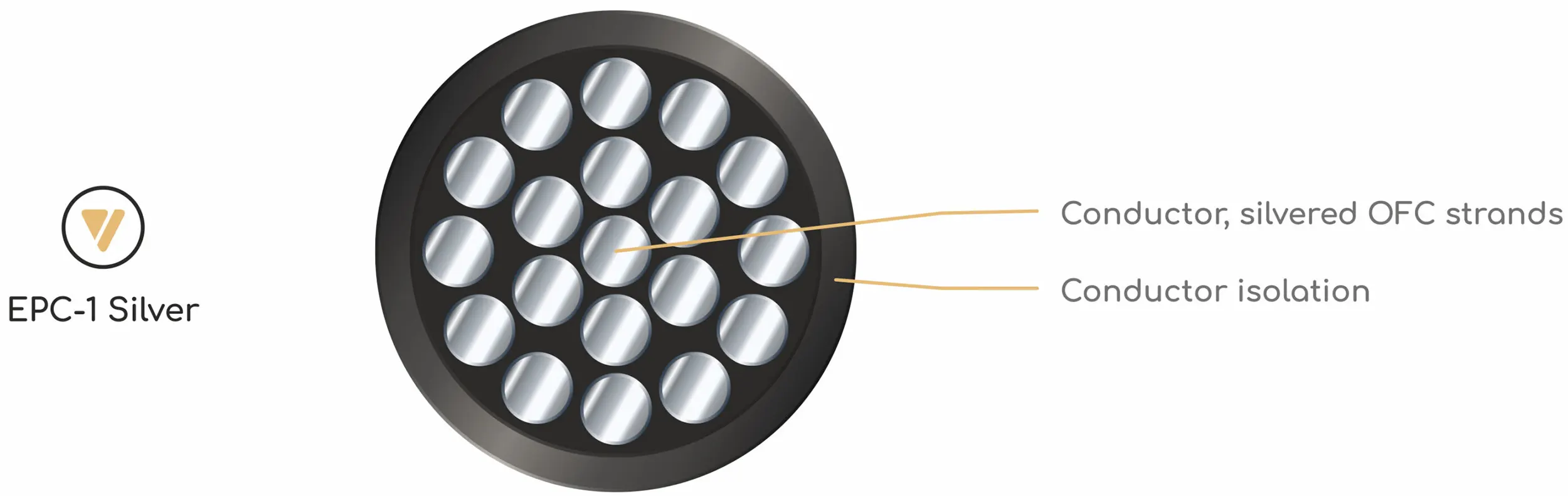 VIABLUE EPC Silver to kable słuchawkowe zapewniające zrównoważony obraz dźwiękowy. Specjalnie opracowane duże przekroje przewodników gwarantują pełną i kompletną transmisję sygnału wierną oryginałowi. Pomimo stosunkowo niewielkich rozmiarów, kable słuchawkowe EPC tworzą ciepłą barwę akustyczną, a także mocny i potężny bas.