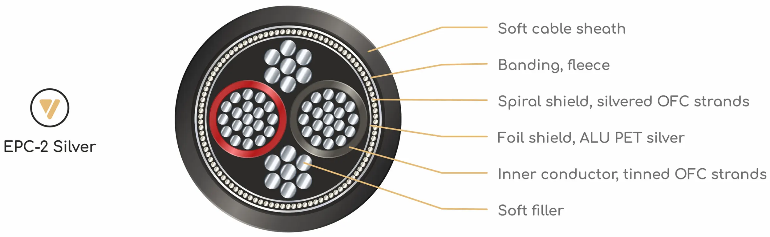 VIABLUE EPC Silver to kable słuchawkowe zapewniające zrównoważony obraz dźwiękowy. Specjalnie opracowane duże przekroje przewodników gwarantują pełną i kompletną transmisję sygnału wierną oryginałowi. Pomimo stosunkowo niewielkich rozmiarów, kable słuchawkowe EPC tworzą ciepłą barwę akustyczną, a także mocny i potężny bas.