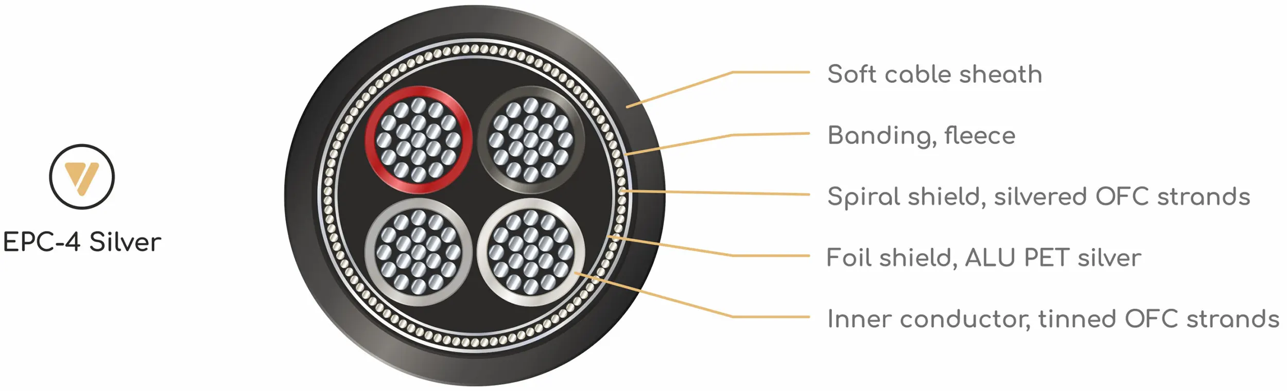 VIABLUE EPC Silver to kable słuchawkowe zapewniające zrównoważony obraz dźwiękowy. Specjalnie opracowane duże przekroje przewodników gwarantują pełną i kompletną transmisję sygnału wierną oryginałowi. Pomimo stosunkowo niewielkich rozmiarów, kable słuchawkowe EPC tworzą ciepłą barwę akustyczną, a także mocny i potężny bas.