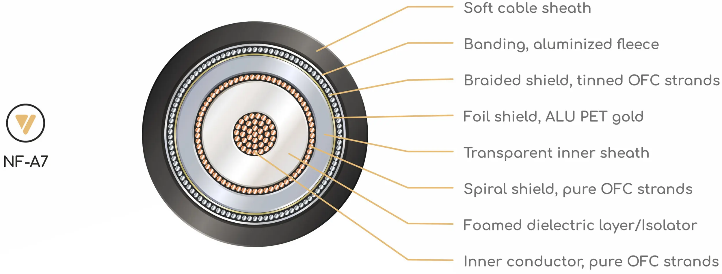 VIABLUE NF-B Subwoofer RCA to specjalnie zaprojektowane kable NF do subwooferów. Masowy przewodnik wewnętrzny, opracowany z myślą o zakresie niskich tonów, jest otoczony warstwą izolacyjną – tzw. dielektrykiem. Obie warstwy pokryte są półprzewodzącą powłoką LDPE oraz dwoma spiralnymi ekranami ułożonymi przeciwbieżnie, wykonanymi z cynowanej i czystej miedzi OFC. Zewnętrzne wykończenie stanowi nasza elastyczna, wyjątkowo miękka osłona audio.