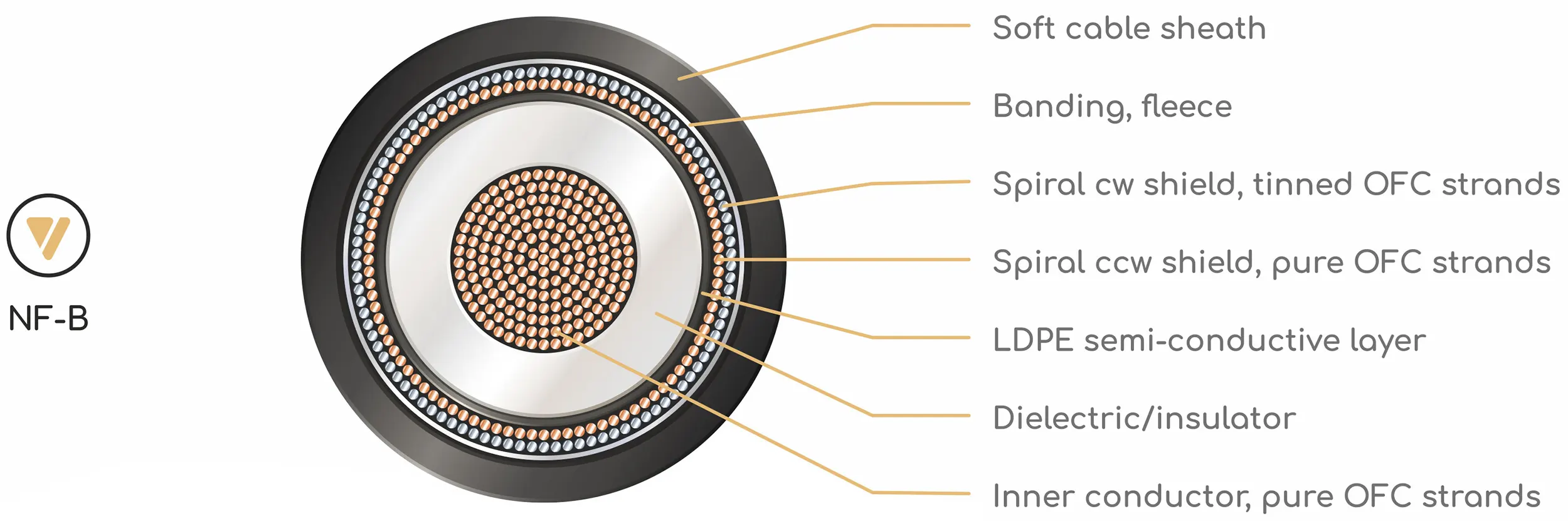Kable VIABLUE™ NF-B Subwoofer RCA to specjalnie zaprojektowane przewody NF dedykowane do subwooferów. Masowy wewnętrzny przewodnik, opracowany z myślą o zakresie niskich częstotliwości, został otoczony warstwą izolacyjną – tzw. dielektrykiem. Całość pokryta jest półprzewodzącą warstwą LDPE oraz dwiema przeciwbieżnymi spiralami ekranującymi, wykonanymi z cynowanej i czystej miedzi OFC. Zewnętrzne wykończenie stanowi elastyczny, wyjątkowo miękki oplot audio.