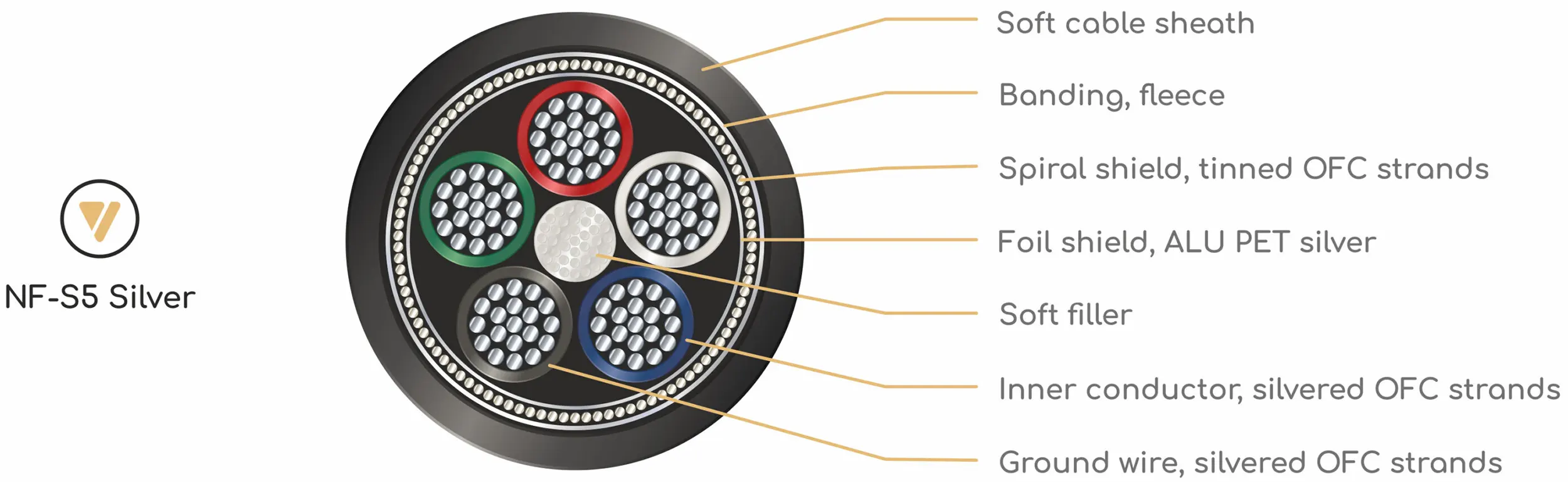 5 wewnętrznych przewodników z posrebrzanej miedzi OFC