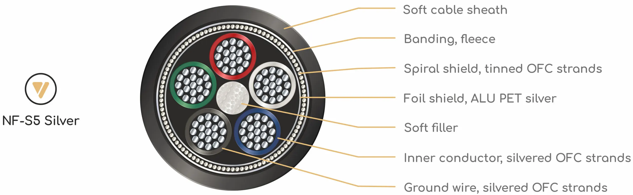 Pięć wewnętrznych przewodników kabla VIABLUE NF-S5 umożliwia różnorodne konfiguracje i opcje podłączeń, w tym wtyki DIN, DIN 90, RCA oraz XLR.