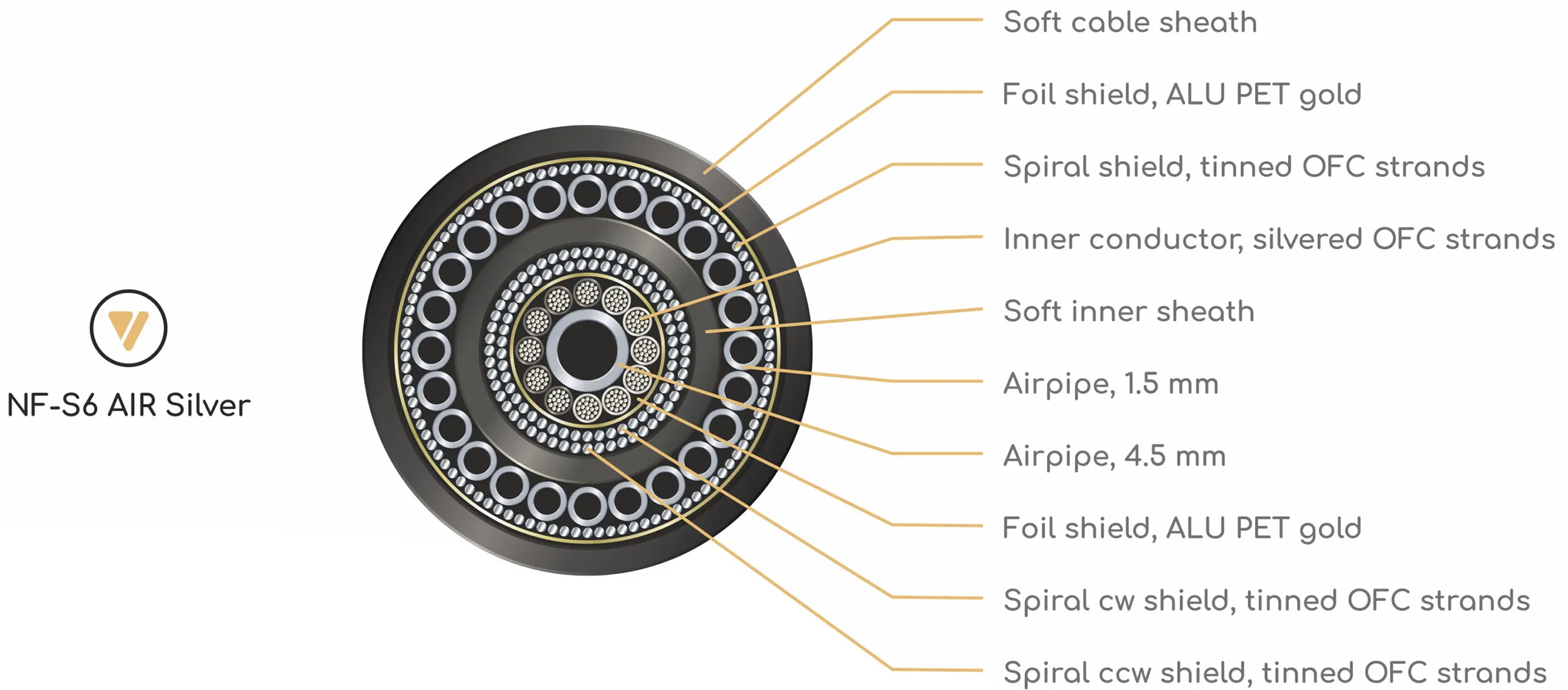 Unikalna konstrukcja NF-S6 AIR wykorzystuje system Air Pipe, który tworzy przestrzeń wypełnioną powietrzem w centrum 12 przewodników. Przewodniki te układają się w idealny okrąg wokół rury powietrznej. Takie rozwiązanie zapewnia całkowitą separację przewodników, co stanowi podstawę dla pełnej i szybkiej transmisji sygnału wiernej oryginałowi.